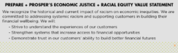 Despite all of this, we at Prepare + Prosper feel hopeful and ever-committed to disrupting the forces that push against equity and justice. We are building DEI into all aspects of our organization—from our customer-facing service delivery to the make-up of our staff and volunteer team to how we show up as partners, as well as our systems work around policy and the financial marketplace. We understand this work is imperative to living out our mission and vision, and know we will be smarter and better as an organization as we look to build financial opportunity and well-being for all.